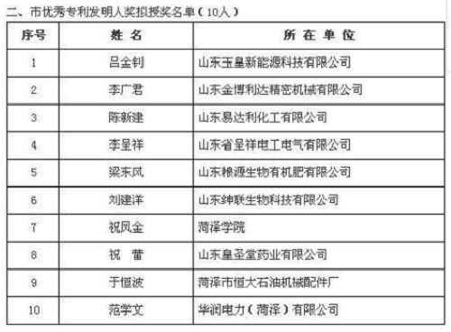 近日,2017年度菏澤市專利獎擬授獎項目名單對外公示,玉皇新能源呂金釗博士成功入圍市優秀專利發明人,同時,兩項專利分別入圍專利獎一等獎、二等獎等榮譽。每年市專利一等獎只有5個,新能源公司已經連續三年獲得市專利一等獎。這充分說明公司具有持續科技創新與自主研發的能力。此外,公司將一如既往加強研發和科技創新轉化,持續提升業績,保持公司的市場競爭力。