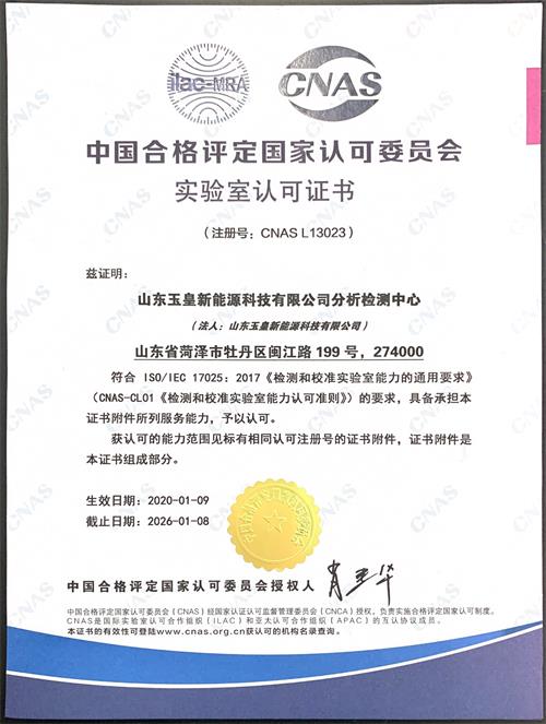 1月9日,玉皇新能源分析檢測中心經中國合格評定國家認可委員會(CNAS) 的認可評審,獲得CNAS認可證書,自此,被正式列入獲得CNAS認可的認證機構名錄。