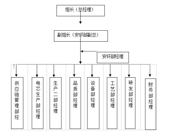 成  員:安環部經理、供應鏈管理部經理、電芯生產部經理、生產二部經理、品質部經理、設備部經理、工藝部經理、研發部經理、財務部經理。