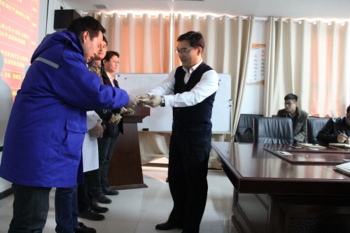 我公司總經理趙成龍主持本次會議,董事長王瑛為獲獎的項目組進行頒獎。獲獎人員陳欣博士作為代表發表了獲獎感言。最后公司董事長王瑛做了最后總結,王總首先對獲獎項目組表示祝賀,并對大家的獲得的研發成績予以充分肯定,描繪了公司以后的發展前景,希望大家在2016年的工作中再接再厲,取得更好的成績。